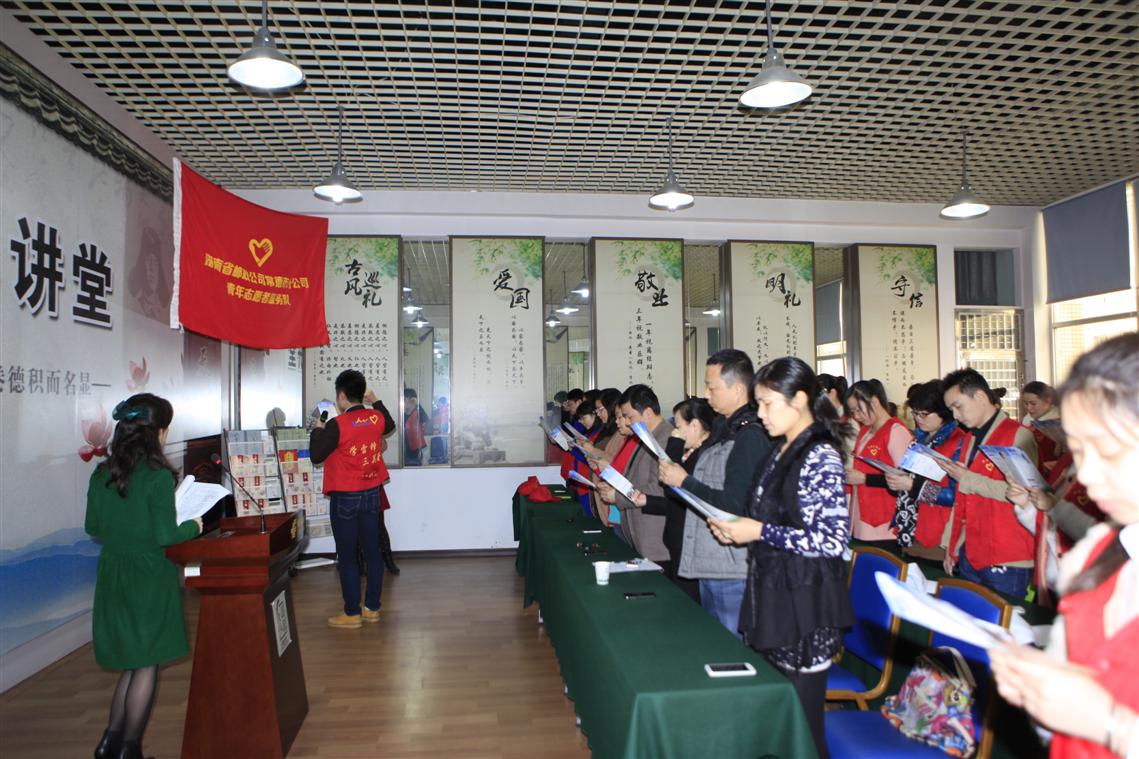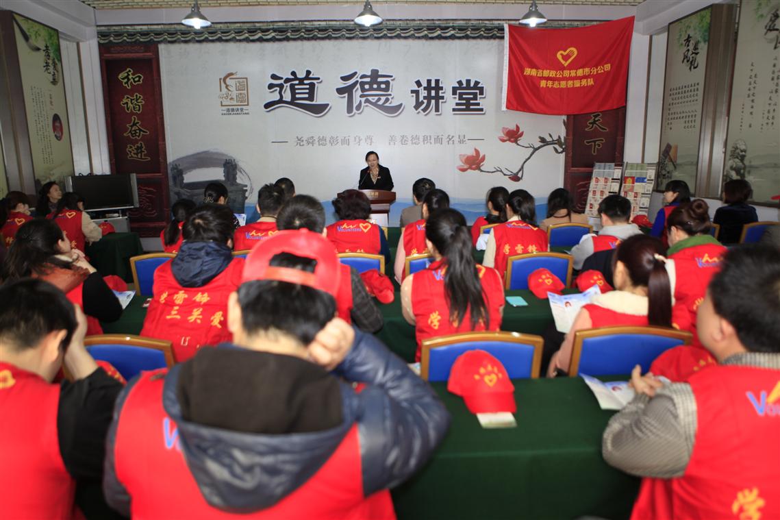 “我承诺:尽己所能,不计报酬,帮助他人,服务社会。实行志愿精神,传播先进文化,为建设团结互助、平等友爱、共同前进的美好社会贡献力量!”3月    21日,常德市邮政分公司四楼道德讲堂室内激情飞扬,统一着装的市邮政分公司相关领导、13个青年文明号集体负责人和30名团委干部齐声宣读志愿者誓词,铿锵有力的言语中无不表露出青年志愿者的爱心、信心和决心。这是常德市邮政分公司今年第一期道德讲堂开讲啦。